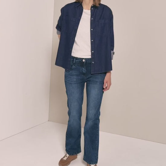 Toronto bootcut-jeansen från CECIL har en figurnära slim fit med hög midja och trendiga utsvängda ben. Den mörkblå tvätten skapar en klassisk look. Bootcut-jeansen vidgar sig mot fållen för en moderiktig look – bekväma och mångsidiga.