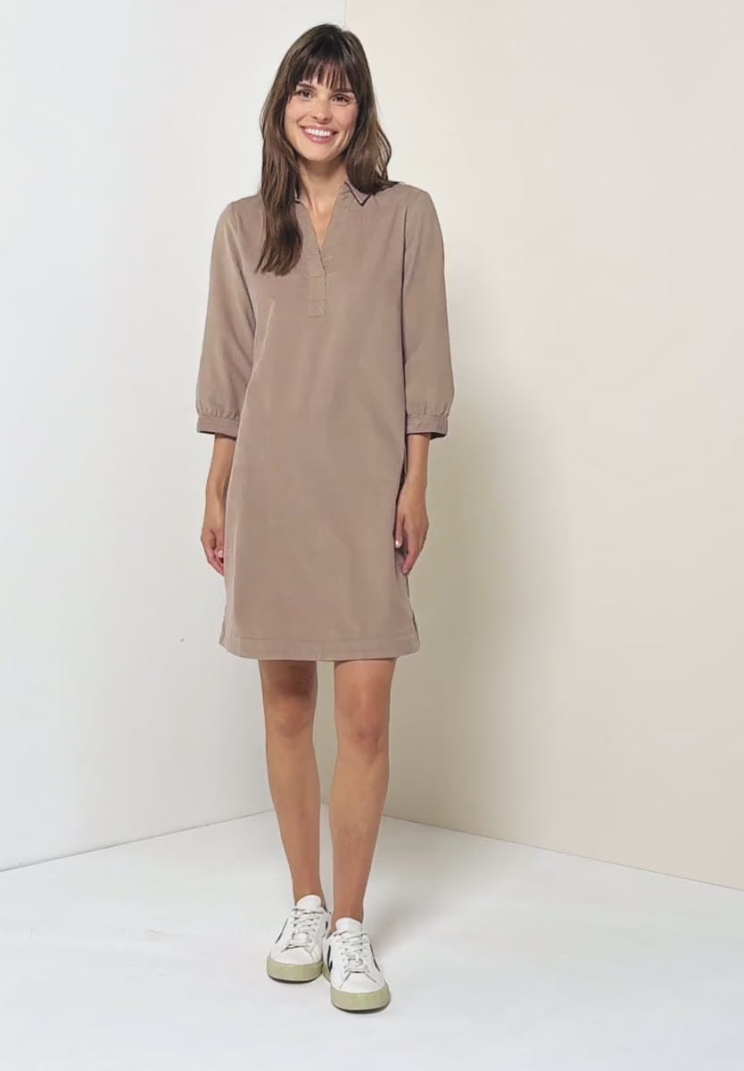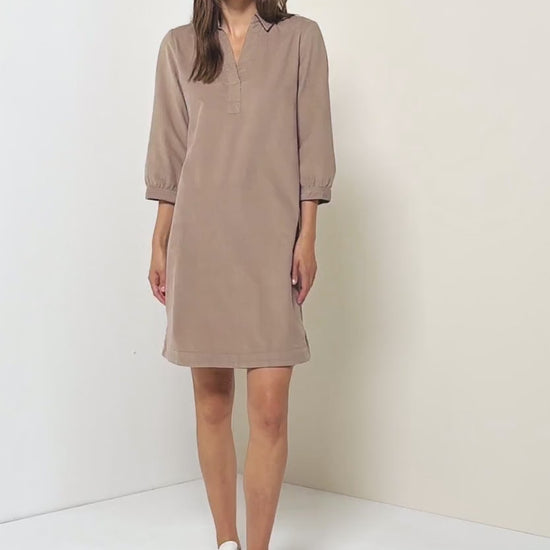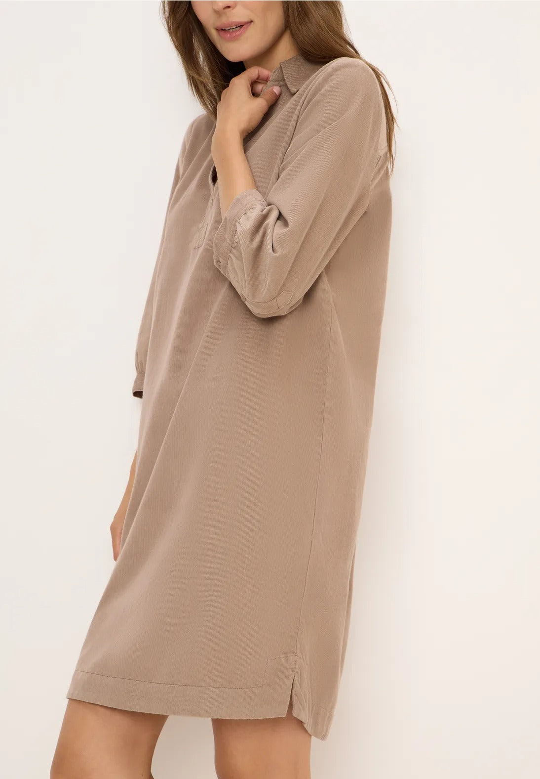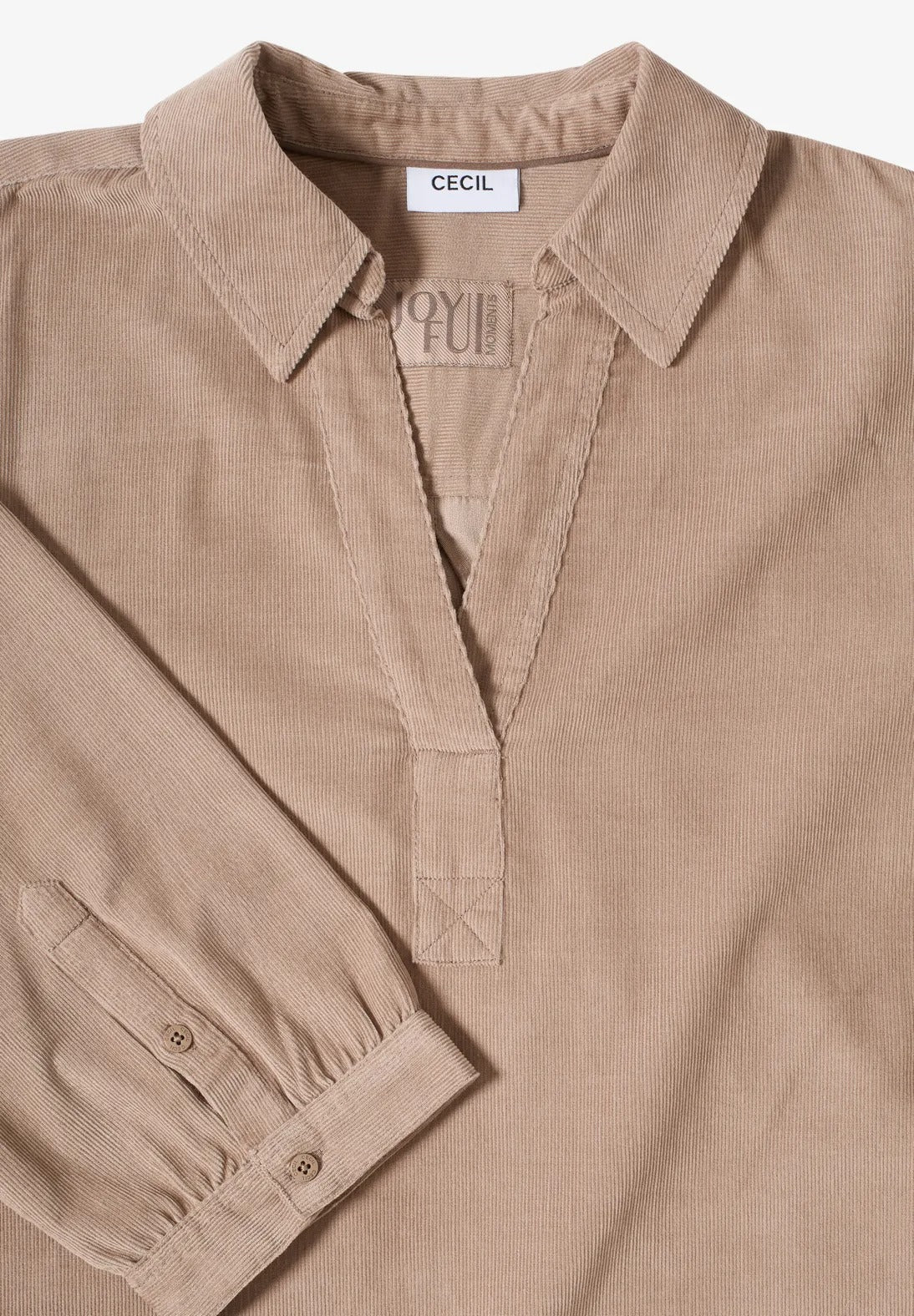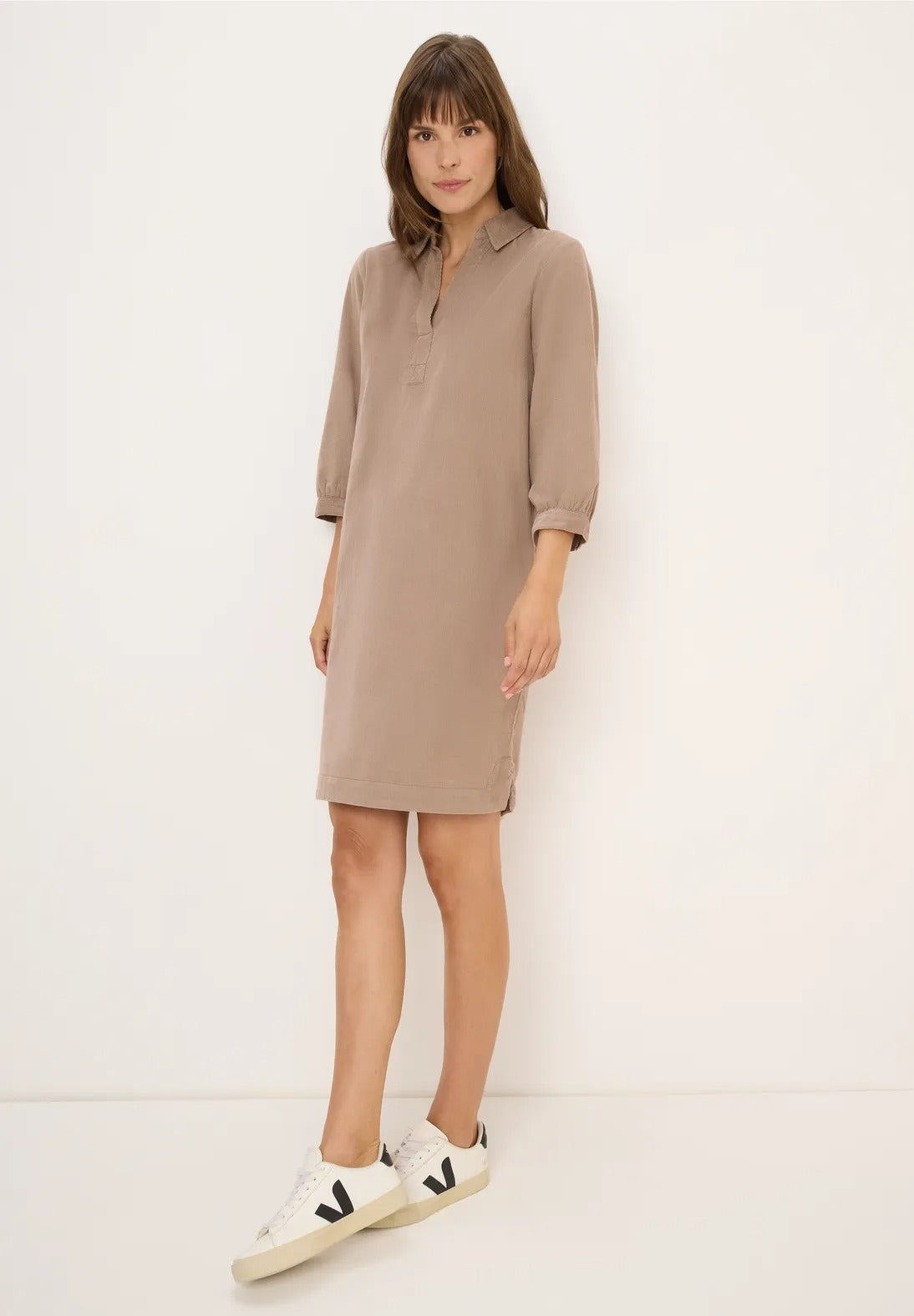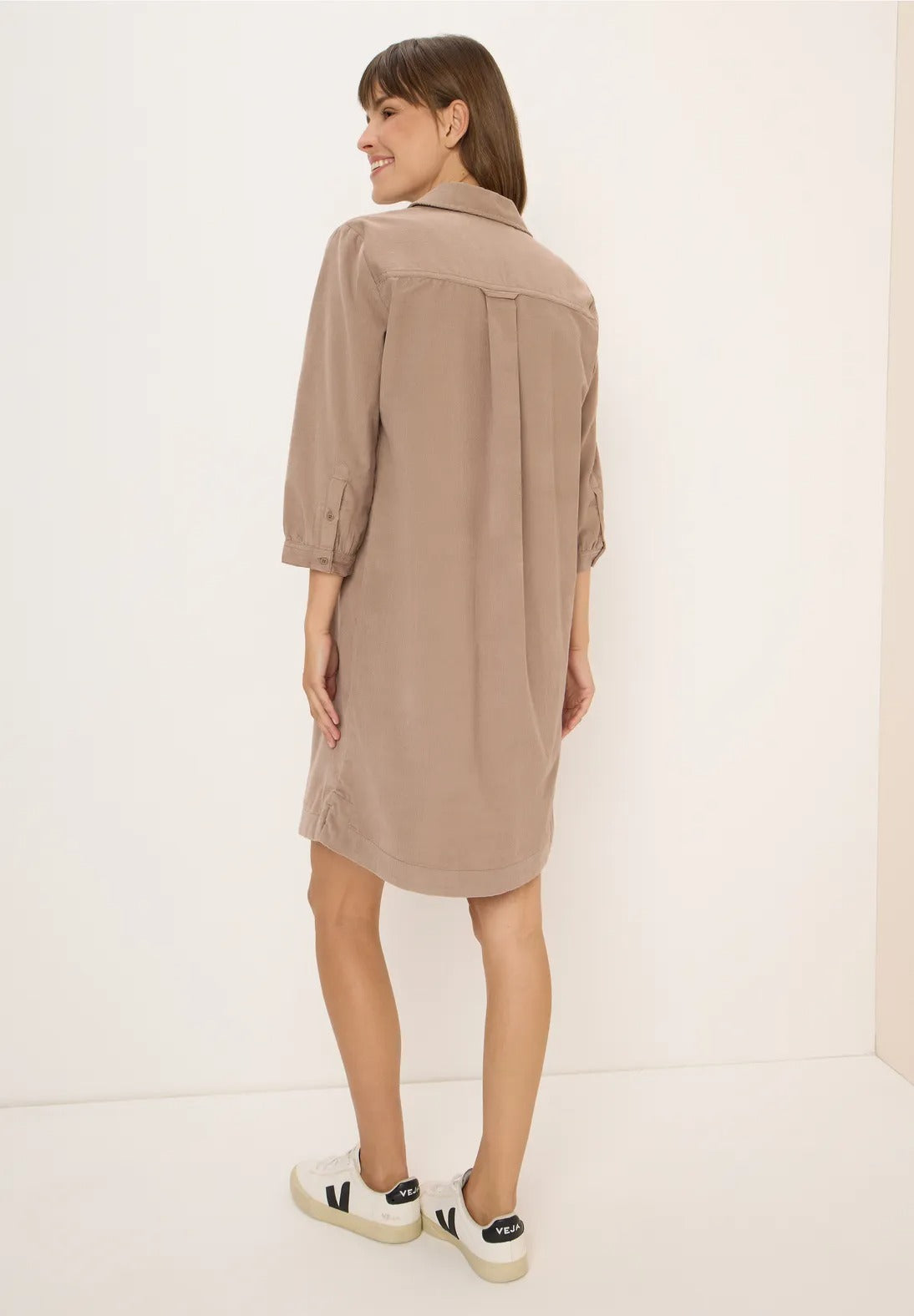 Denna knälånga manchesterklänning från CECIL för kvinnor imponerar med sin bomullskvalitet och charmiga slitsade halsringning. 3/4-ärmar med knappar i ärmsluten och en rundad nederkant fulländar den okomplicerade looken. Perfekt för din bekväma vardagsstil med lite extra.