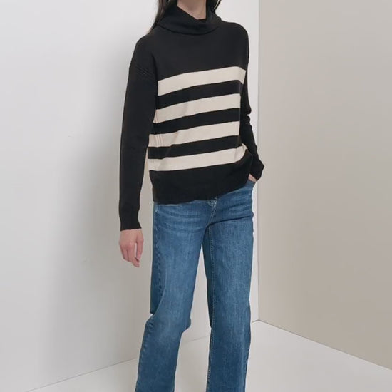 Denna mjuka polotröja från CECIL kombinerar ett tidlöst randigt mönster med en mysig känsla. Den höga kragen och det mjuka stickade tyget ger värme och komfort, medan ribbade muddar fulländar looken. Perfekt för svala dagar med stil.