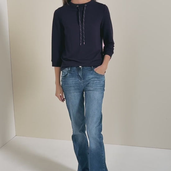 Den ottomanska tröjan från CECIL för kvinnor har en fin textur och en trendig trattringning. De 3/4-långa ärmarna och den bekväma passformen gör den till den perfekta följeslagaren för snygga vardagskläder. Perfekt för en bekväm och välvårdad look.