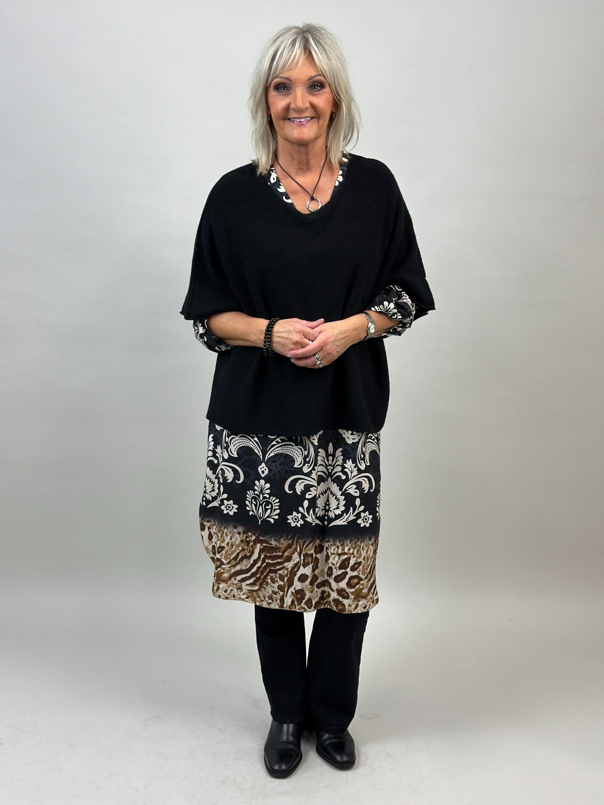 Möjligheterna är oändliga med Ponchotröja Nessa - en mångsidig poncho som kan bäras på olika sätt. Kasta den över dina axlar som en traditionell poncho eller styla den som en tröja med den vidare ärmöppningen. Den är det ultimata tillskottet till din vardagsgarderob, vilket ger en extra touch av stil och komfort.